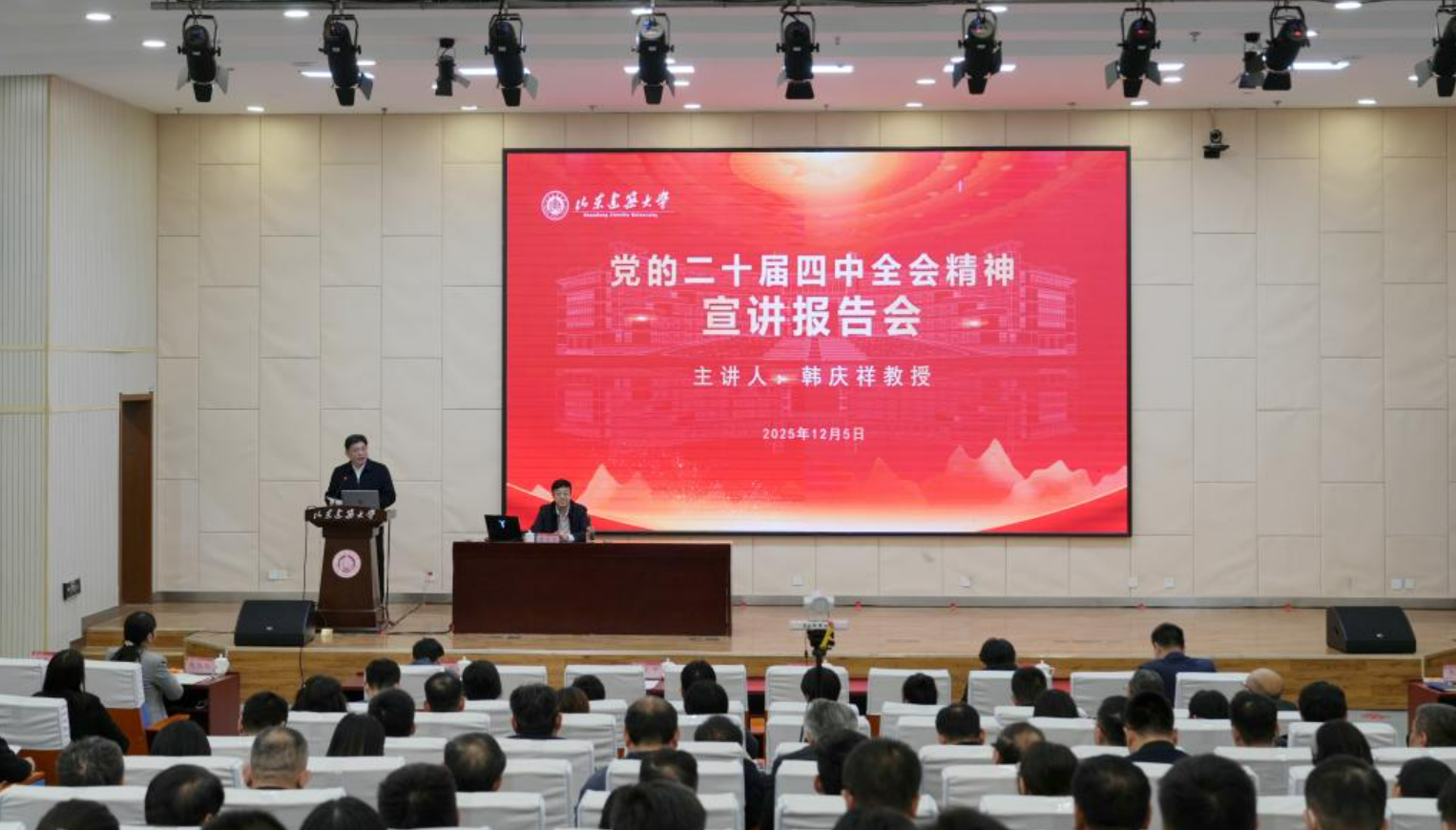 12月5日,山东建筑大学举办党的二十届四中全会精神专题宣讲报告会,特邀国家哲学社会科学一级教授、中央党校专家工作室领衔专家韩庆祥教授主讲。学校党委书记杨景波、领导班子成员、中层以上干部、思政课教师及师生代表共同参加学习,报告会由学校党委副书记许记中主持。