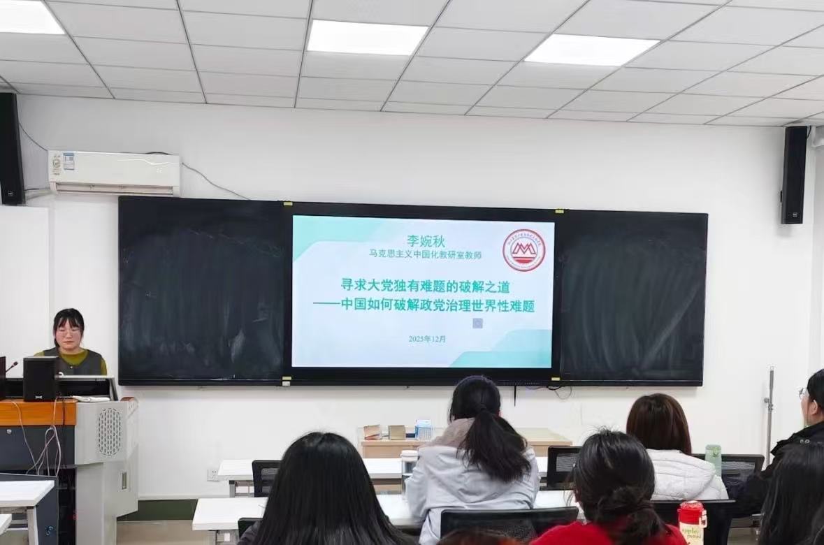 12月10日,山东建筑大学马克思主义学院“青马筑梦”第五期学术沙龙在BG217教室顺利举行。本次活动聚焦政党治理核心议题,邀请马克思主义中国化教研室优秀青年教师李婉秋博士以“寻求大党独有难题的破解之道——中国如何破解政党治理世界性难题”为主题做报告,学院研一全体新生参会。