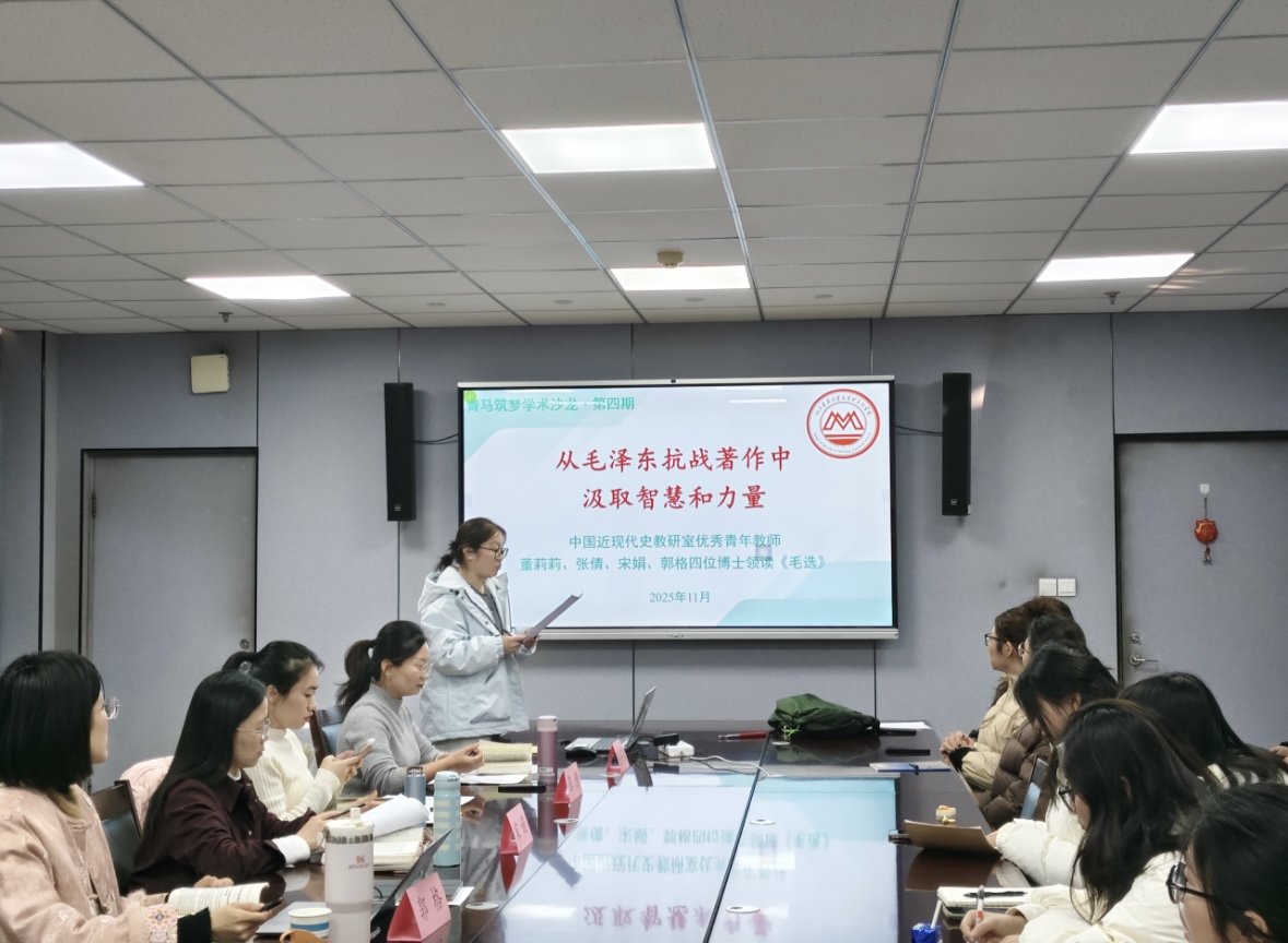 11月19日下午,山东建筑大学马克思主义学院在BG202教室举办“青马筑梦”第四期学术沙龙。本次活动邀请中国近现代史教研室优秀青年教师董莉莉、张倩、宋娟、郭格四位博士共同领读《毛泽东选集》,带领学生从毛泽东抗战著作中汲取智慧和力量。活动由2025级研究生班委张峻绮主持,马克思主义学院2025级研究生共同参与。