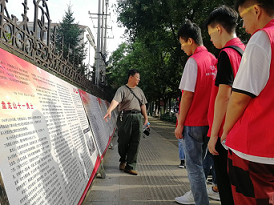 第二日,为扩大宣传范围,使红色文化的理念更加深入人心,,实践服务团在临朐县民兵训练基地副主任、《临朐县军事志》主编刘传党同志的帮助下,协助当地人民武装部举办了临朐红色故事展。活动中,刘传党同志通过讲述展板上所记录的照片和抗战时期的革命烈士的相关故事,吸引了抗战老兵、英雄子女等大量市民驻足观看。此外,“红色山东”实践服务团的实践成员也作为志愿者热心地为市民进行讲解,在锻炼了表达能力的同时,更全面感受到抗战时期革命先驱自强不息的民族精神, 深刻认识到革命胜利和幸福生活的来之不易,意识到新时代青年肩负着的国家的重任。