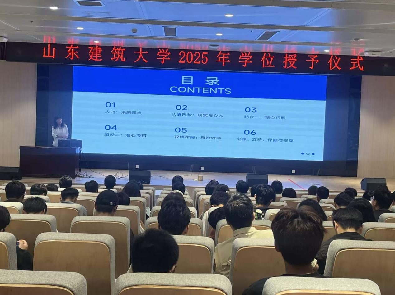随后,蒋玮炜从“抗战胜利80周年阅兵”入题,聚焦新时代青年的责任担当,勉励学生尤其是毕业生认清形势、找准适合自己的发展路径,实现自我价值和社会价值;并聚焦毕业生求职核心需求,从升学、就业的不同发展路径为高年级学生答疑解惑,以具体案例拆解求职中的常见问题与应对思路,为同学们提升求职竞争力提供实操性指导。