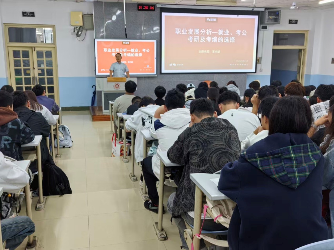 马立国长期深耕“新工科”领域的科研服务与成果转化,他结合自身在产业前沿的实践经历,深入浅出地剖析了“新工科”背景下的新兴行业发展趋势与人才需求变化,鼓励同学们在大学伊始就建立“规划意识”,将个人成长与国家战略和产业发展需求相结合。王方明结合十年公职类就业指导经验和八年分校管理运营经验,从公职类就业的宏观政策、招考流程、备考策略等多个维度进行了系统梳理,凭借丰富的实战案例讲解了如何高效准备相关考试科目,并分享了实用的面试技巧,为有意向的同学提供了清晰的行动指南。