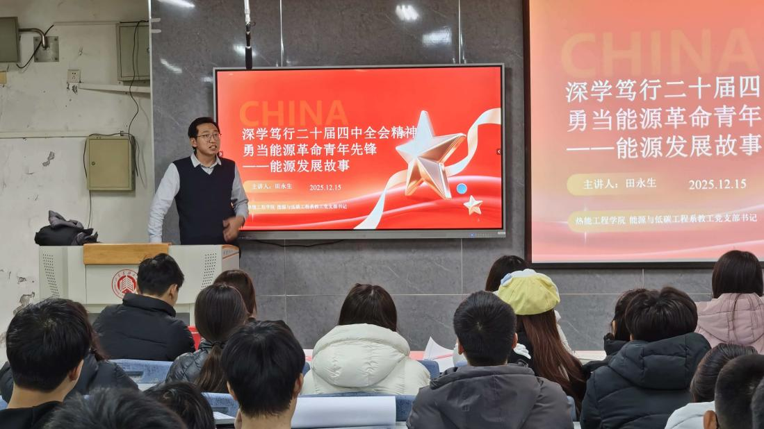 为深入学习宣传贯彻党的二十届四中全会精神,推动理论学习往深里走、往实里走、往心里走,11月至12月,热能工程学院党委精心谋划、分层推进,构建起“书记带头讲、教师融合讲、学生接力讲”的立体化宣讲格局,组织开展了“学思践悟党的二十届四中全会精神”系列宣讲活动,实现了学习宣传全员覆盖、精神要义全程贯通,为学院高质量发展注入了强大的思想动能与实践合力。