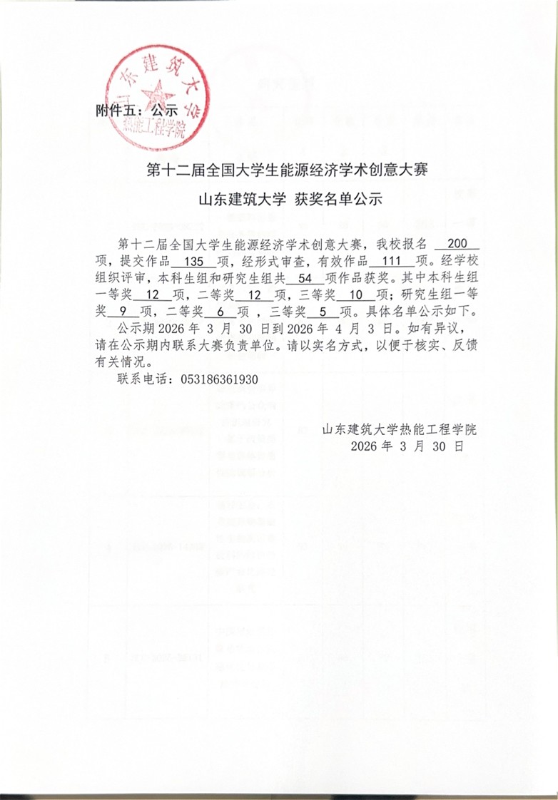附:第十二届全国大学生能能源经济学术创意大赛山东建筑大学获奖名单