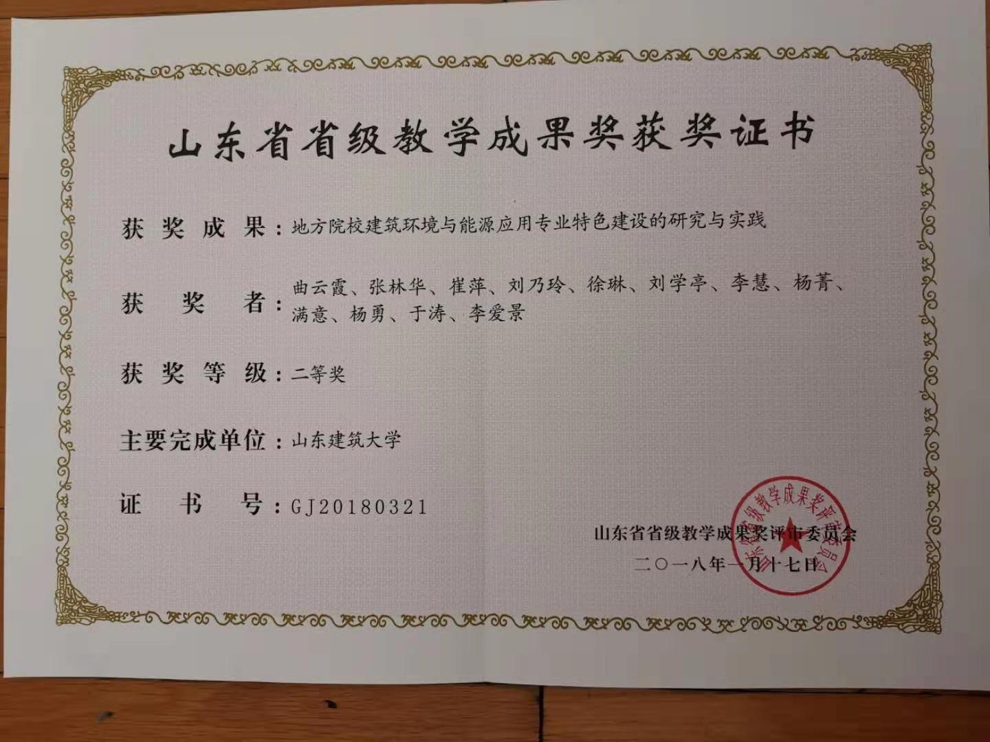获奖:山东省省级教学成果奖二等奖—地方院校建筑环境与能源应用专业特色建设的研究与实践
