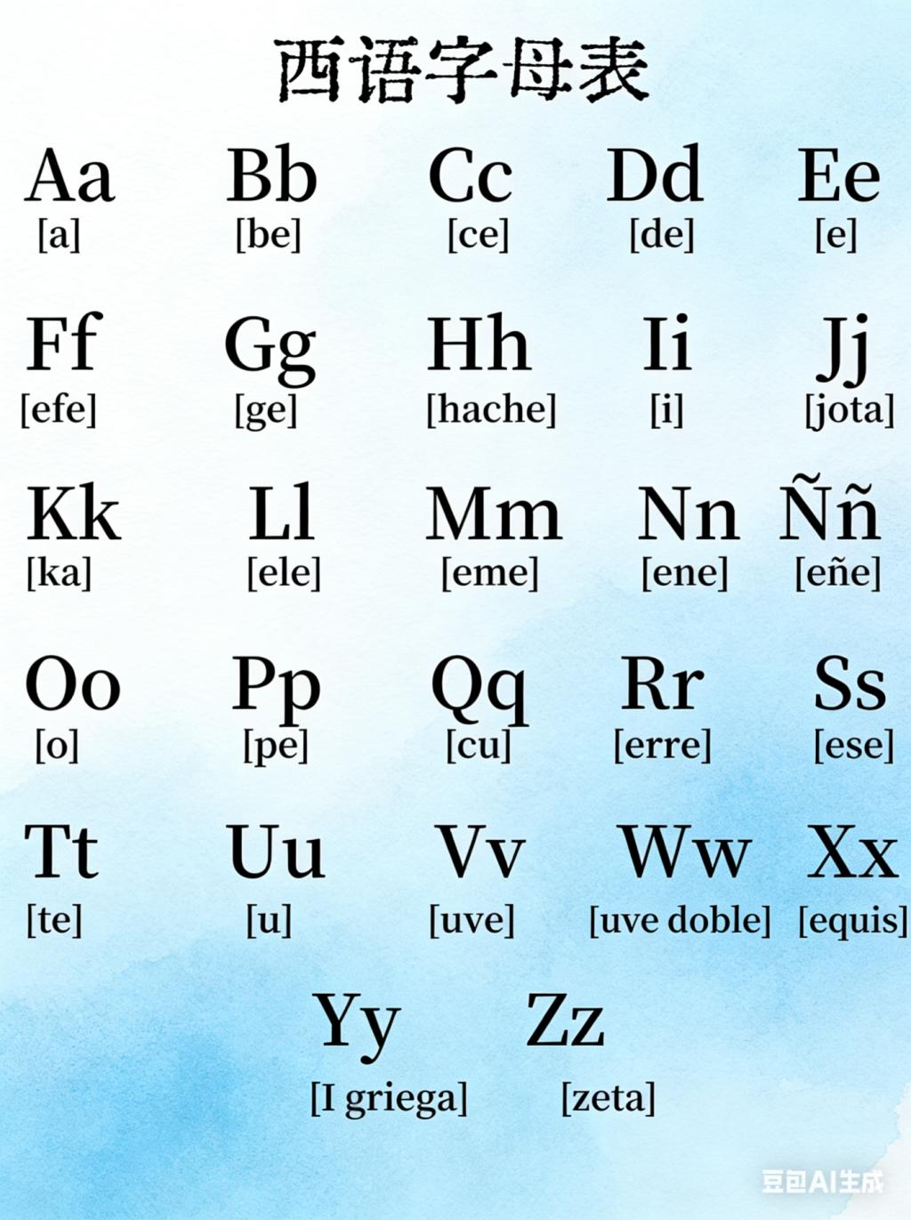 西班牙语字母表(Alfabeto español)由27个字母组成,完整的西班牙语字母表如下: