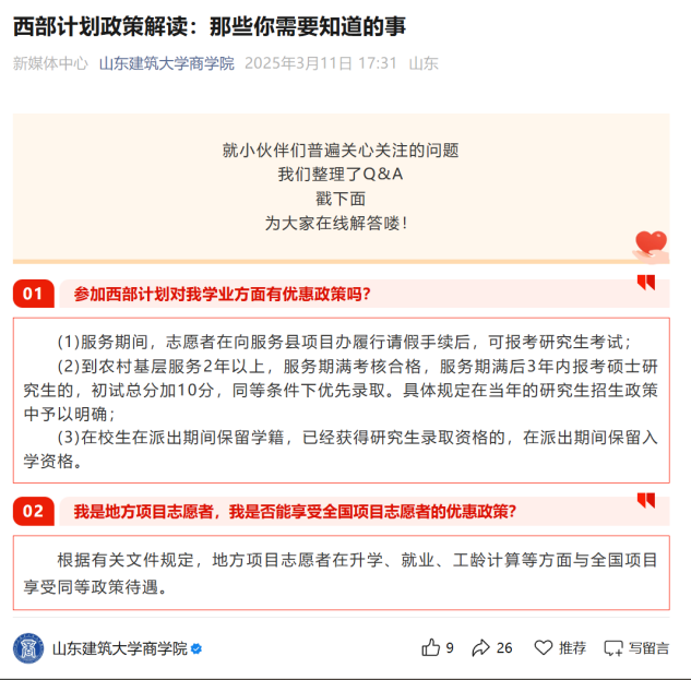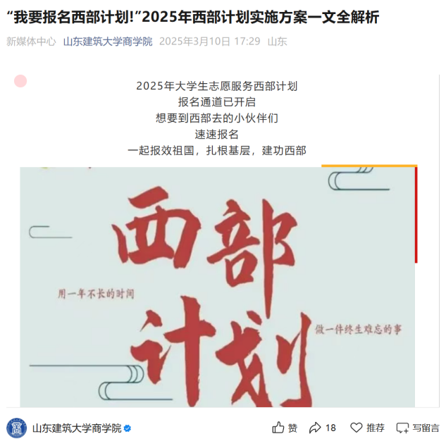学院始终聚焦人才培养特色,将西部计划作为链接专业教育与社会实践的重要纽带,构建“政策宣讲精准化、榜样引领具象化、服务保障常态化”工作机制,通过专题讲座、志愿者返校分享会、线上政策专栏等多元形式,实现政策触达全体学生;建立“全周期跟踪培养”体系,从报名指导、岗前培训到在岗反馈全程跟进,引导学子将专业所长转化为服务基层的实际能力,树立“扎根西部、奉献国家”的青春导向。