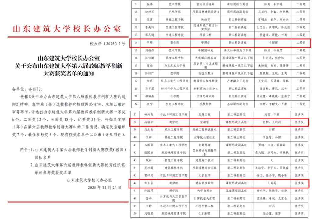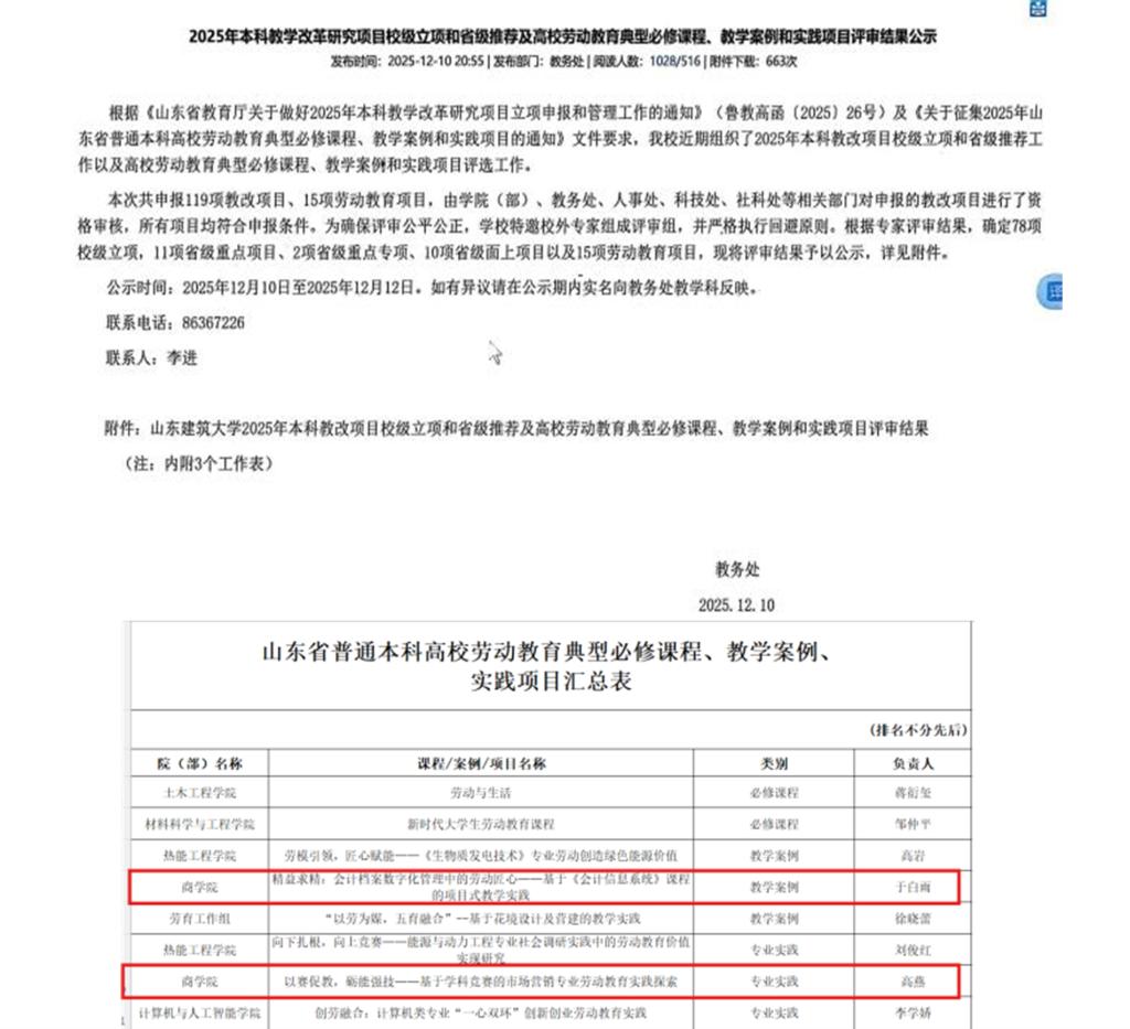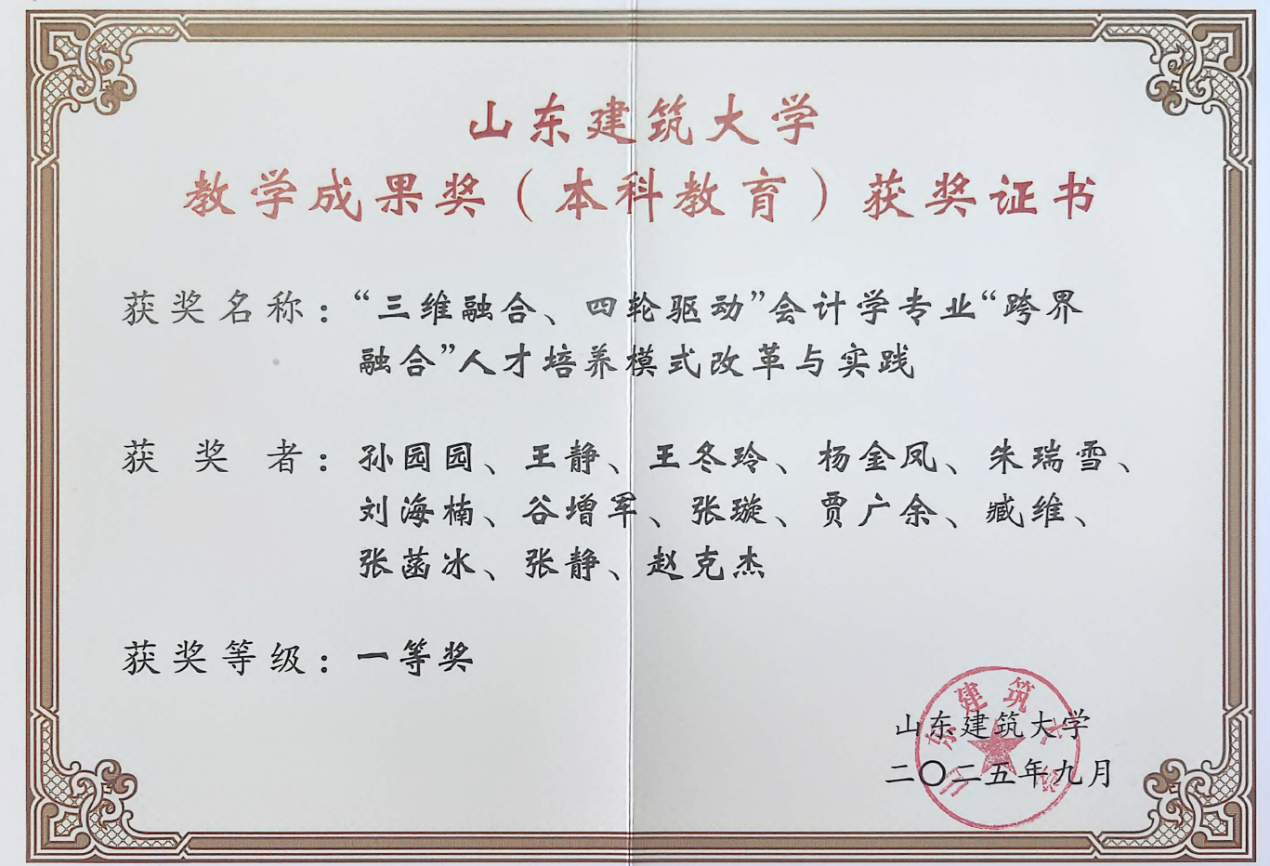 一是教学成果与课程建设亮点突出。作为第一完成人,王静院长获省级教学成果奖一等奖,徐功文副院长获省级教学成果奖二等奖,孙园园老师获校级教学成果奖一等奖;王硕老师主编教材获评省一流本科教材,张娟、张玉华两位老师主讲课程入选校级课程思政示范课程。二是教研项目与专业建设扎实推进。王静院长获批省级教改项目 1 项,吴永春、冯震两位老师获批校级重点教改项目 2 项,王硕、单士甫两位老师获批校级一般教改项目 2 项,于白雨、高燕两位老师负责的劳动教育项目分别获得省级推荐。三是专业布局持续拓展。智能会计微专业顺利开班,首批36名学生已正式进入课程学习阶段。四是实践基地建设成效显著,获批市级“数字经济专业建设”项目及校级优秀校外实习基地各 1 项。五是师生综合能力彰显,师生代表获学校首届消防安全技能比赛第一名。