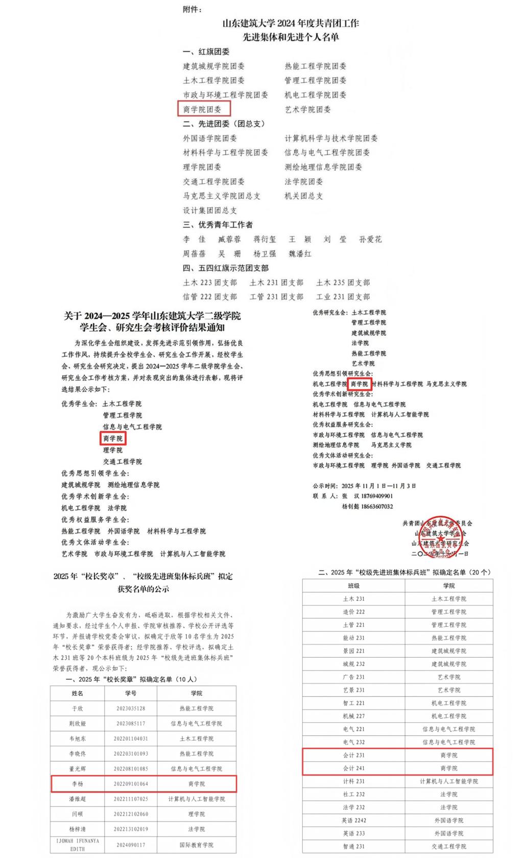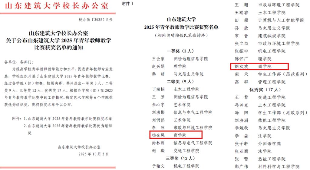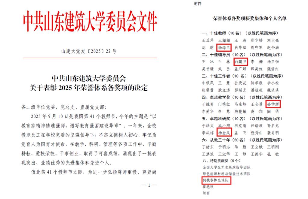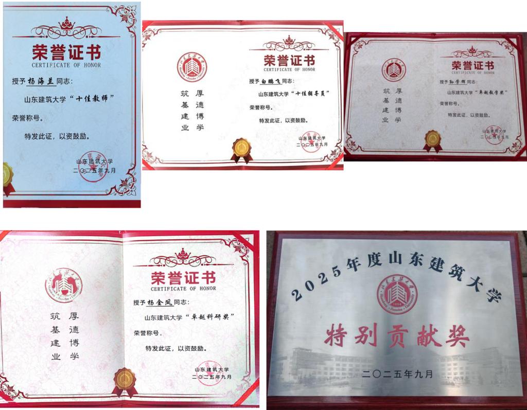二是荣誉称号成果丰硕。杨海兰教授获评山东建筑大学 “十佳教师”,白鹏飞老师获评“十佳辅导员”,孙学辉老师获“卓越教学奖”,杨金凤老师获“卓越科研奖”,冯宇老师作为教练带领的伺拽客棒垒球队获“特别贡献奖”。24 名老师获评校级优秀指导教师一等奖,16 人获评校级优秀指导教师二等奖,形成了爱岗敬业、追求卓越的良好氛围。