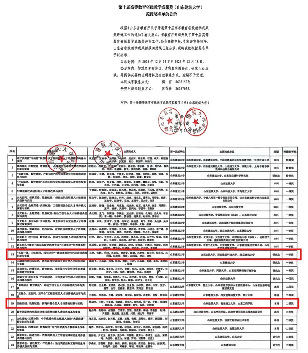 一是省级创新平台成功获批。学院申报的“山东省数字经济产业创新中心”正式获得山东省工业和信息化厅批准设立。该中心依托学校建筑学科优势与学院“商工融合”办学特色,着力培养兼具建筑行业背景与数字经济素养的复合型人才。平台获批标志着我院在数字化转型与数字人才培养方面的实践成果获省级层面的权威认可。