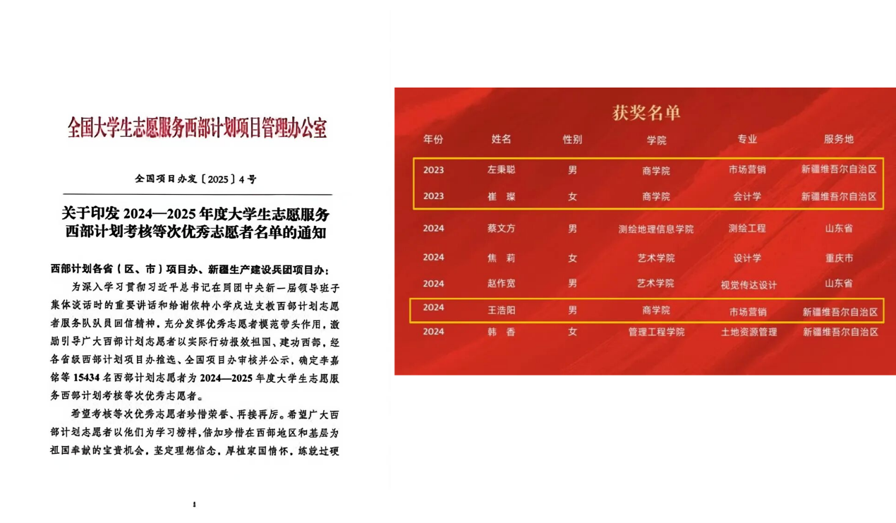 一是思政引领与集体建设成果丰硕。学院先后获评 “红旗团委”“优秀学生会”“优秀研究生会”“家访工作先进学院”“5・25 心理健康节优秀组织单位”“网络文化节优秀组织单位” 等称号。学生集体与个人荣誉实现“大满贯”,会计231、会计241获评“校先进班集体标兵班”,多名学子获评“校长奖章”“十大优秀学生”“十大自强不息优秀学生”等校级最高学生荣誉。社会实践与志愿服务成效显著。“商心筑梦·热血燃情”实践团队在2025年“推普助力乡村振兴”全国大学生暑期社会实践志愿服务活动中获评“优秀团队”,并获教育部语言文字应用管理司、共青团中央青年发展部来信表扬。共青团流动少年宫实践团队获评省级优秀实践团队。4 名毕业生入选 “西部计划” 志愿者,其中 3 人获评全国优秀西部计划志愿者。原创心理情景剧代表学校参加第八届全国心理情景剧大赛现场展演,实现赛事历史性突破。