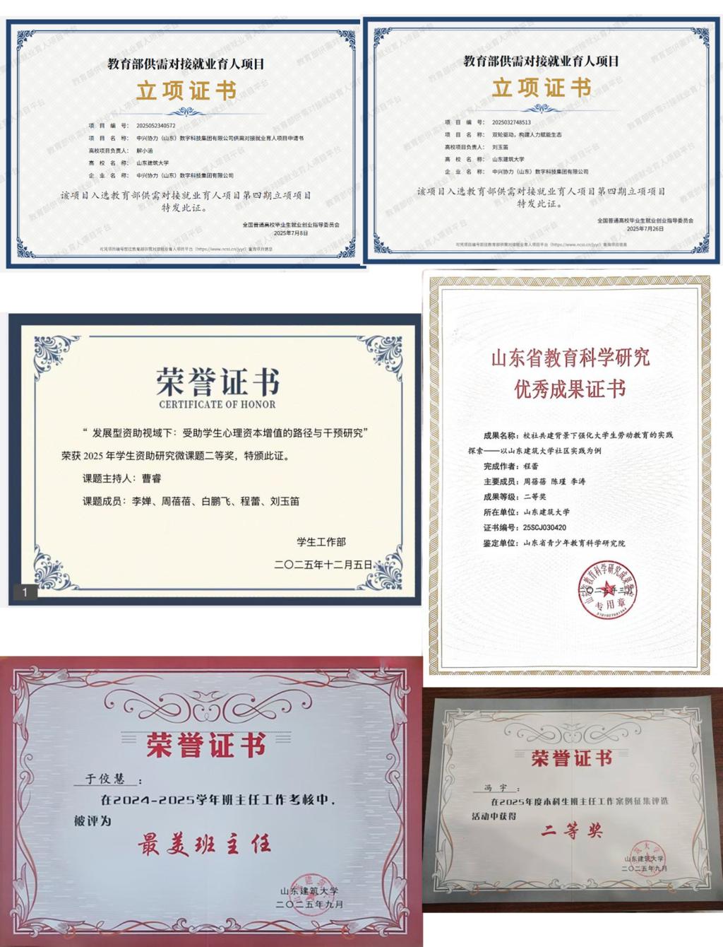 三是学工队伍专业化发展显著。学工队伍获评“山东省优秀辅导员”等省级荣誉4项、“十佳辅导员”等校级荣誉20余项。解小涵和刘玉笛两位老师成功立项“教育部第四期就业育人项目”2项,曹睿和程蕾老师分别荣获2025年度学生资助课题二等奖1项、山东省教育科学优秀成果二等奖1项。在班主任工作案例征集活动中,于白雨老师和冯宇老师分别获得一等奖1项、二等奖1项,于佼慧老师获评学校“最美班主任”,队伍的专业化、职业化水平持续提升。