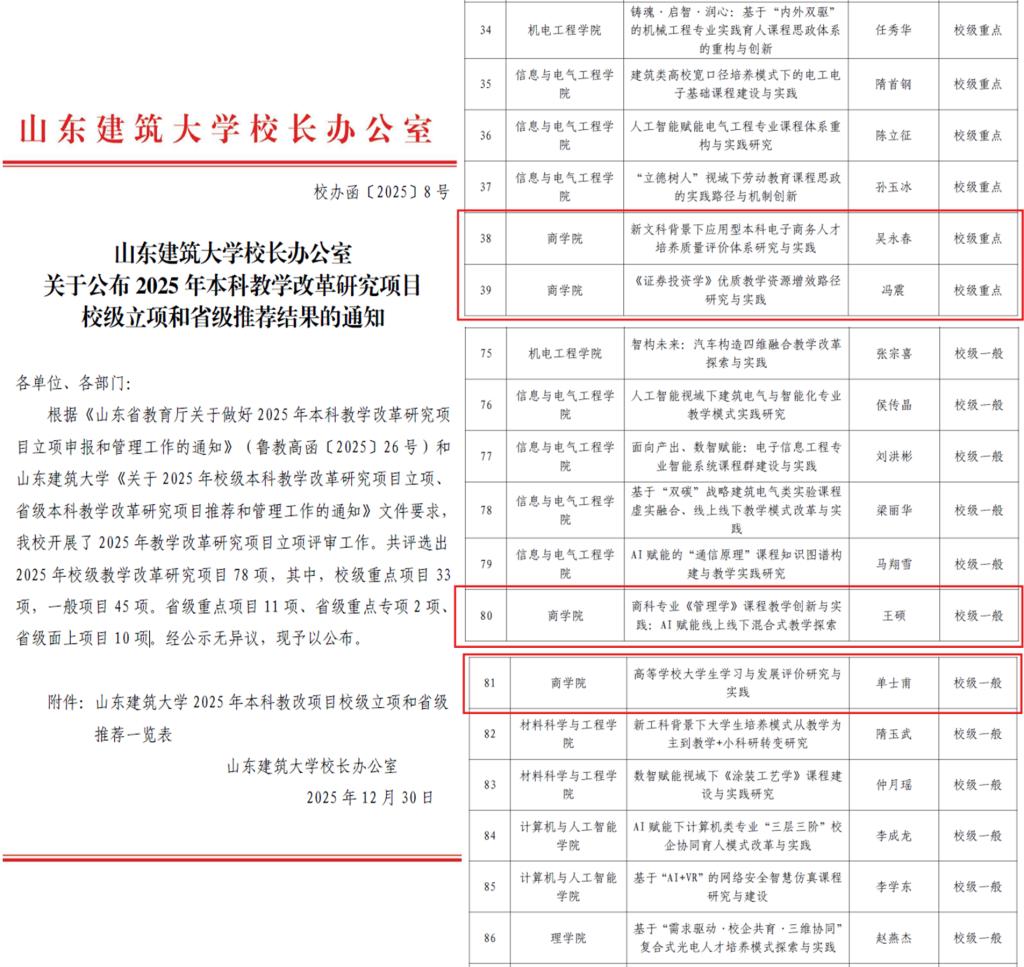 回望2025 年,在学校党委和行政的正确领导下,山东建筑大学商学院以习近平新时代中国特色社会主义思想为指导,深入贯彻党的教育方针和全国教育大会精神,牢牢把握立德树人根本任务,围绕学科优化、专业建设、科研创新、社会服务能力提升等核心方向,凝心聚力、锐意进取,在党建引领、教学改革、科研攻坚、人才培养等方面取得丰硕成果,为服务国家战略与区域发展贡献了积极的商科力量。