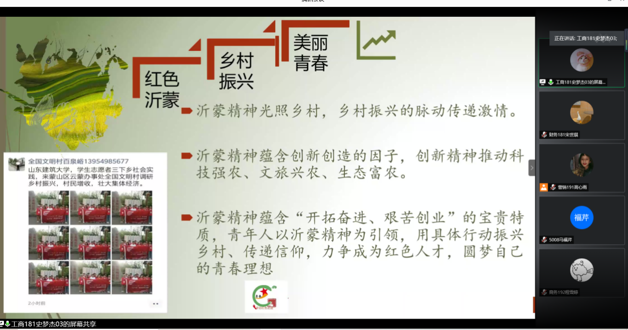 受新冠肺炎疫情影响,今年各实践团队严格本着线上实践、属地实践和分散实践为主的原则,各团队结合疫情,总结往期的实践经验,提出了自己的见解。“走进武松之乡”社会实践团队分享了“互联网+”农业为特色产业做出科学的调研和收获实践心得,为此次线上实践团队提供了思路;“寻访红色足迹”社会实践负责人讲到了解历史,接受爱国教育,宣传红色文化,为临沂红色旅游产业做出贡献;“毕业生职业发展”调研团队追踪商学院毕业生职业发展方向,了解人才需求发展,针对企业、高校人才需求转换提出建议对策。“青春创业筑梦农村”实践团队,聚焦金乡县马庙镇产业发展现状,梳理当地大蒜产业近年来的变化历程,通过查询资料、专题研讨、实地考察总结乡村振兴经验,结合专业特长,提出特色小镇发展方案。