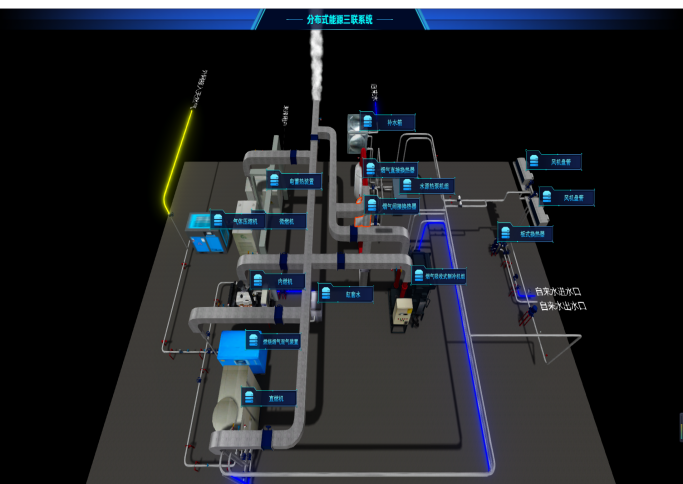 1、仿真模拟能源综合利用系统流展示2、微燃机、内燃机、余热锅炉(换热器)等设备的构造,利用动画演示充分体现内燃机、微燃机联共系统的工作原理。
