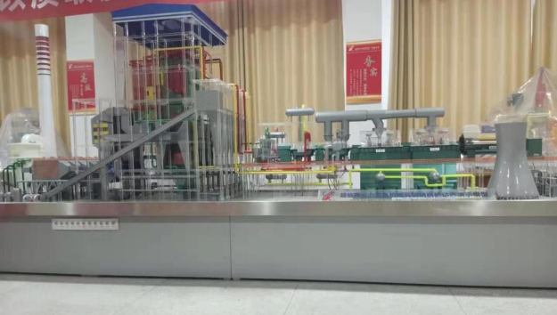 1000MW超临界火电厂整体演示教学系统,以东方电气集团公司生产的火力发电厂超临界燃煤π型炉机组为原型,按照实物的一定比例制作,尺寸6000mm×1200mm×2200mm(其中台座高600mm),包括锅炉系统(输煤系统、制粉系统、锅炉本体、风烟系统、除尘、除灰系统、烟气脱硝系统、烟气脱硫系统)、汽轮机热力系统(汽轮机本体、凝汽器、凝结水系统、除氧给水系统、循环水系统)、发电机系统、升压站系统,辅以模型演示灯光控制系统,可显示火电厂系统设备的结构,演示工质的工作流程。