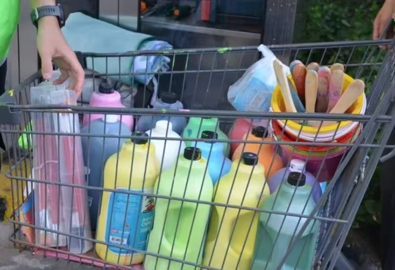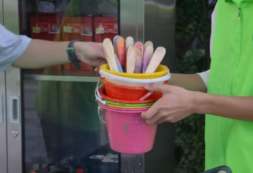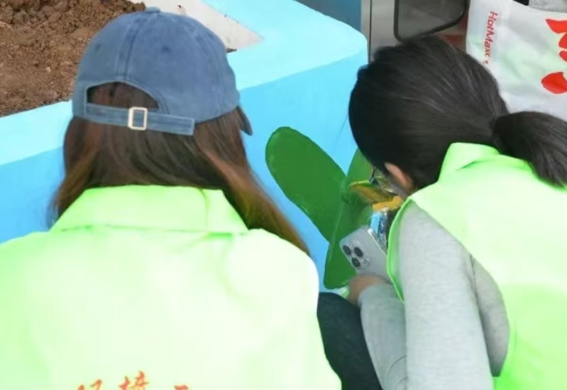 在活动筹备阶段,学生团队围绕“减塑限塑,绘说文明”核心主题推进工作。从元素的创意构思到色彩搭配的反复调试,到优化绘画细节,最终敲定与社区场景高度适配的彩绘方案:主视觉用手绘布袋、回收标志等元素凸显减塑主题,色彩贴近社区环境;留空白互动区,让社区居民从看客变主角,以创作者身份参与进来,用画笔留下专属印记。