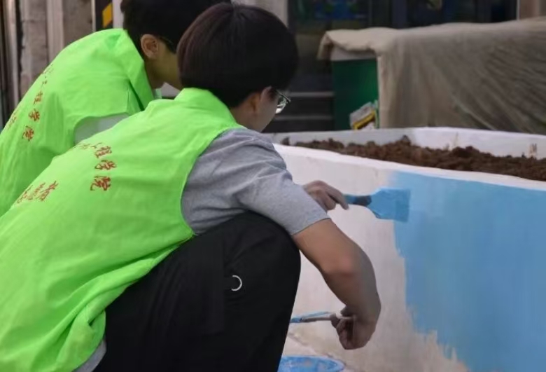 活动开始,学生们携带颜料、画笔等工具提前到位,分工明确,线条组以精准笔触勾勒画面轮廓,为进一步创作打下基础;调色组对照设计稿细致调配色彩,确保色调统一和谐;上色组则专注细节填充,耐心处理边缘衔接,严防颜料溢出。过程中,不少社区居民与过往同学驻足观赏,主动探寻彩绘背后的设计巧思,志愿者们以热忱传递创作初心,让现场不仅是开展公益实践的地方,更化作触摸温暖的互动港湾。