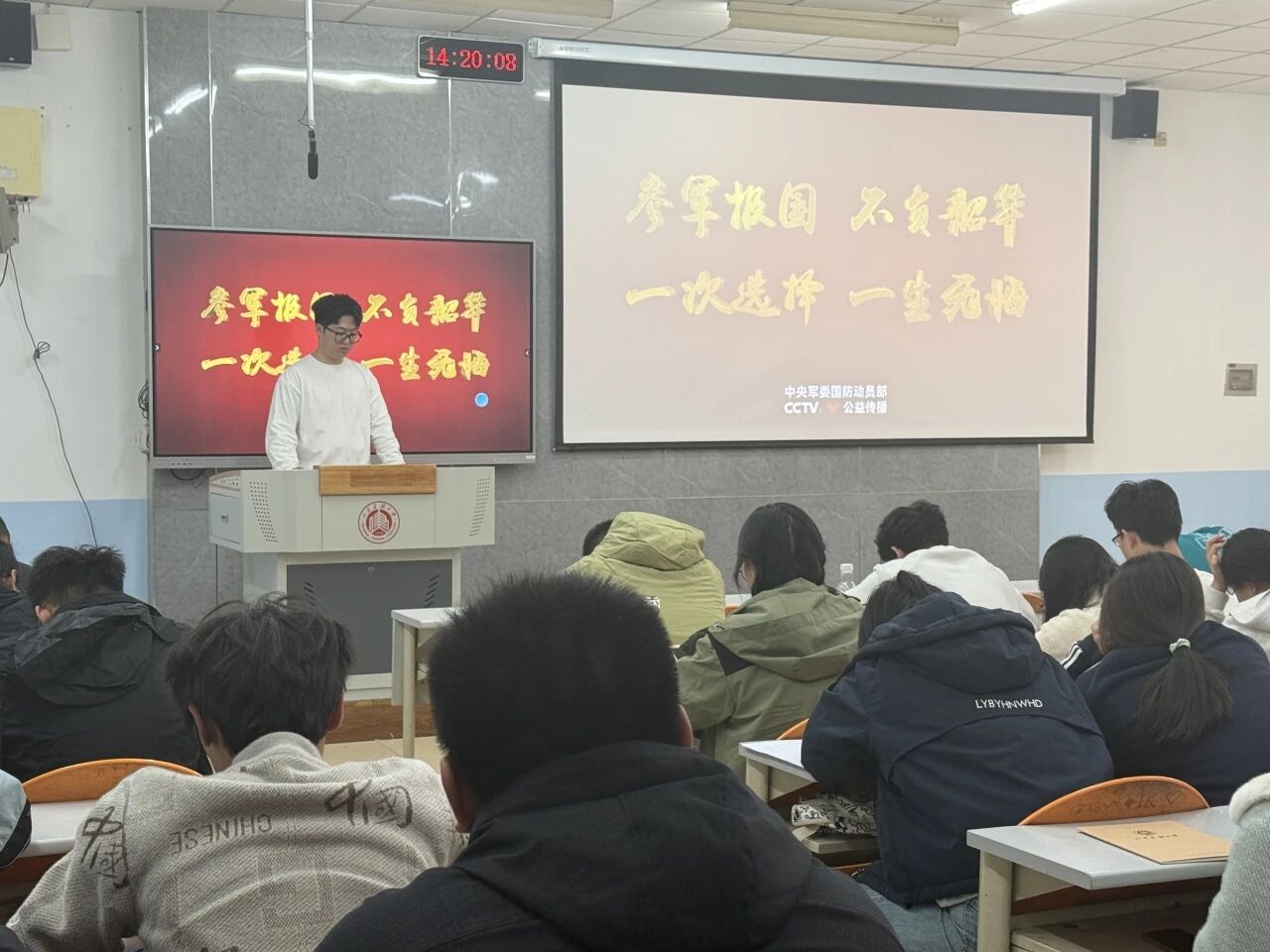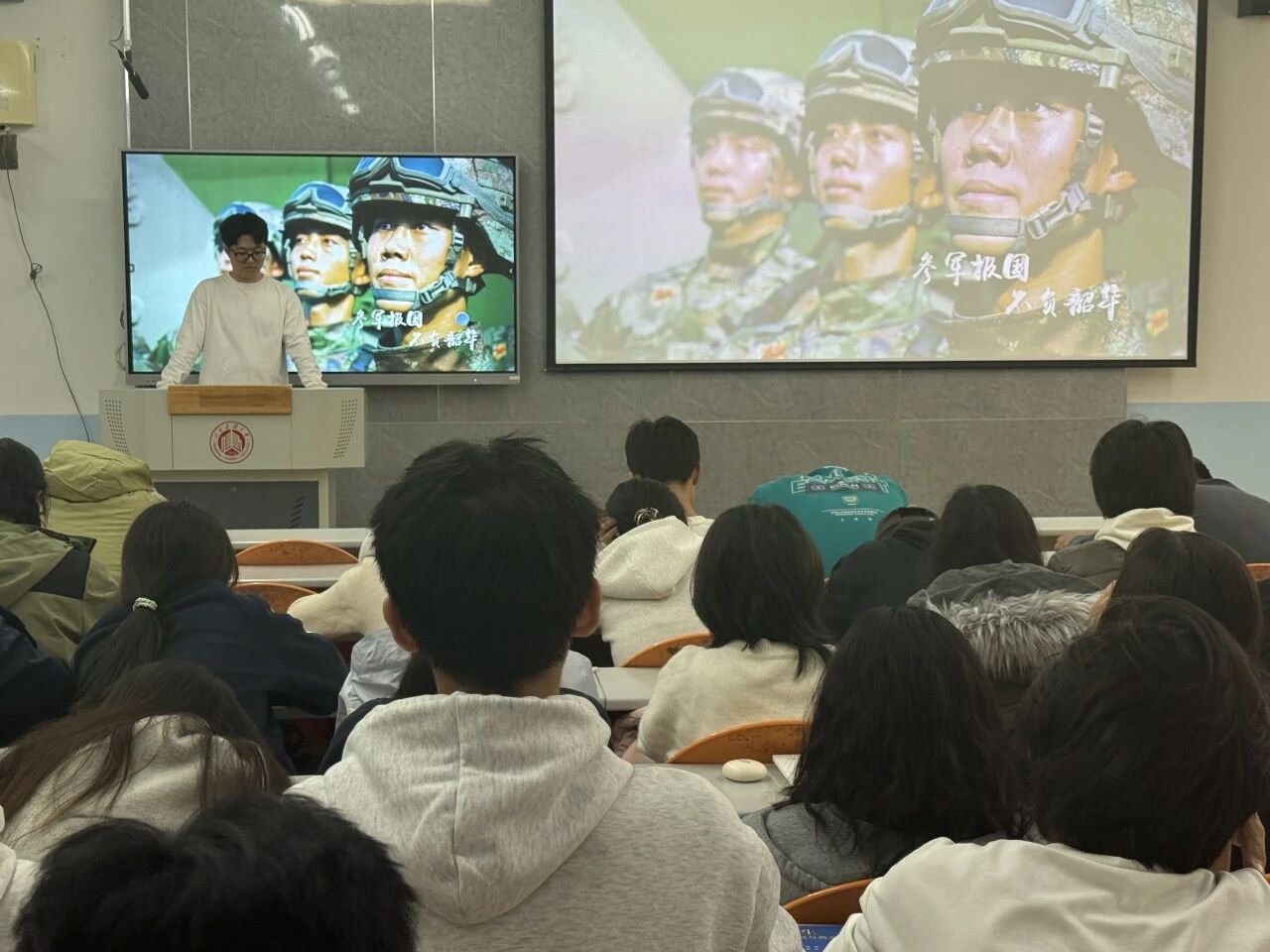 为积极响应国家征兵号召,激发青年学子参军报国热情,学院组织学生集中收看由国防部征兵办公室制作的征兵宣传片《参军报国不负韶华》与微电影《逐梦青春》。以电影影像为媒介,向同学们传递强军正能量,引导同学们感悟强军使命,树立保家卫国的青春志向。