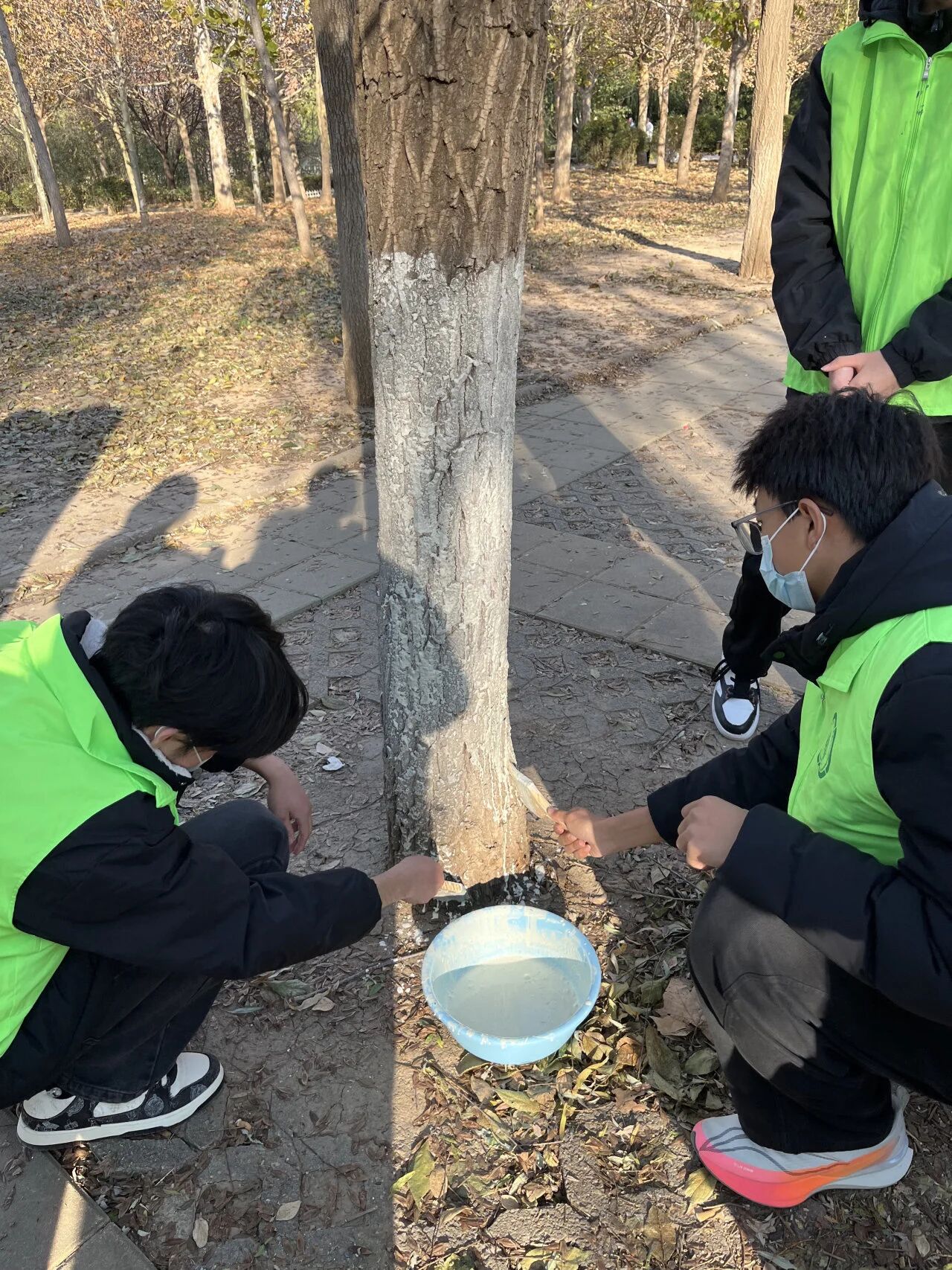 时值冬日,校园内的树木进入休眠期。对树干进行涂白,是保护树木安全越冬的重要养护措施,既能有效防止冻害、日灼,又能消灭树皮内越冬的病虫害。志愿者分工协作,有的提桶,有的刷树,戴上手套,抄起“家伙”开启了热火朝天的护绿劳动“大比拼”,确保大小树木一株不漏全部穿上白色的“防护服”。同学们严格遵循“涂白统一、涂层均匀无脱落、树干无杂物残留”的标准,认真完成了责任区域内的树木养护任务。