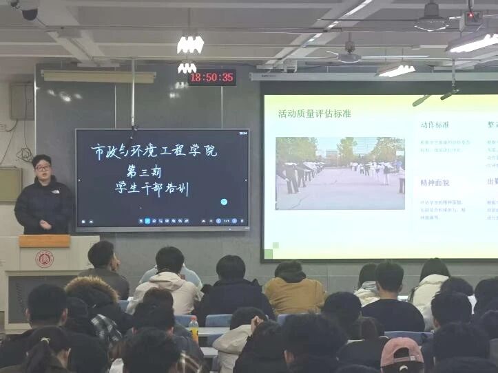 最后,学生会主席团成员王子轩以“考核赋能成长,担当点亮青春”为主题进行讲解,让大家明确学生干部考核条例及考核标准。并且,王子轩用“任务完成 工作态度 团队协作 纪律遵守 创新贡献”总结学生干部考核标准,激励2025届全体干事向上向好发展。