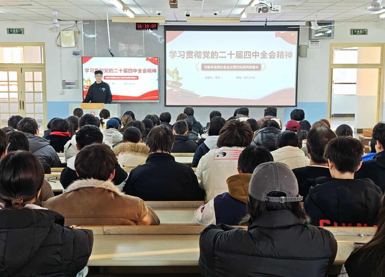 为深入学习贯彻党的二十届四中全会精神,引导青年学子准确把握时代脉搏、勇担强国使命,2025年12月4日,山东高校青年师生宣讲团学生成员法学223学生常天一走进市政环境与工程学院,在博文501为师生带来了一场主题鲜明、内容深刻、贴近青年的专题宣讲。