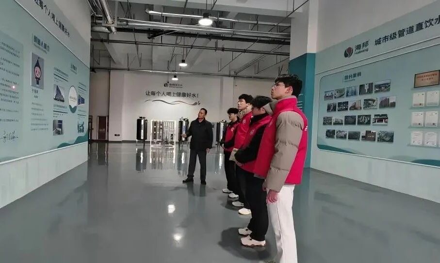 活动伊始,在企业导师的引导和讲解下,团队成员们先后参观了企业的文化展厅和生产车间。在展厅内,团队成员们通过图文并茂的展板和实物模型,系统了解了公司的企业文化、研发创新历程以及众多服务案例,深刻感受到企业深耕行业的责任与担当。在生产车间,团队成员们近距离观察直饮水处理设备的生产与组装过程,亲眼见证从原水到健康直饮水的蜕变,对所学的水处理专业知识有了更为直观和深刻的理解。