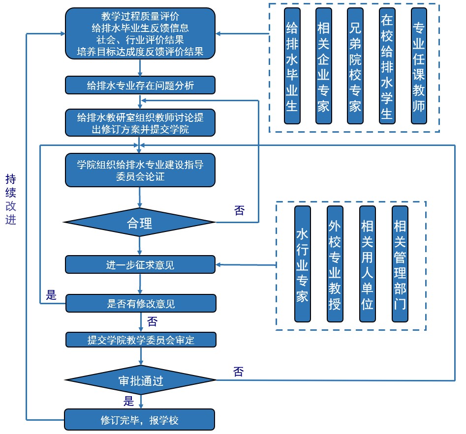 给排水科学与工程专业与我国社会经济和城镇化发展结合紧密,基于水行业发展需求和OBE国际化人才培养理念,构建学生、教师、毕业生、用人单位与行业专家广泛参与的多维度人才培养评价、修订与反馈机制(图5)。通过人才培养方案修订与持续改进,优化人才培养方案,培养与国际接轨、服务区域经济建设的高水平应用型人才。
