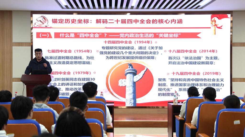开班仪式结束后,团校第一课正式开讲。学院党委副书记王培森围绕党的二十届四中全会精神内涵,以深刻的理论阐释和鲜活的实践案例为全体学员讲授党课。他强调,党的二十届四中全会为“十五五”规划擘画了崭新蓝图,希望全体青年以团校为学习主阵地,深入领会全会精神,掀起学习热潮。他鼓励学员在思想交流中找准时代方位、坚定奋斗方向,做到学以致用、知行合一,将个人理想融入国家发展大局,在中国式现代化建设的征程中奋勇争先,以青春之我、奋斗之我,为实现中华民族伟大复兴贡献智慧与力量。