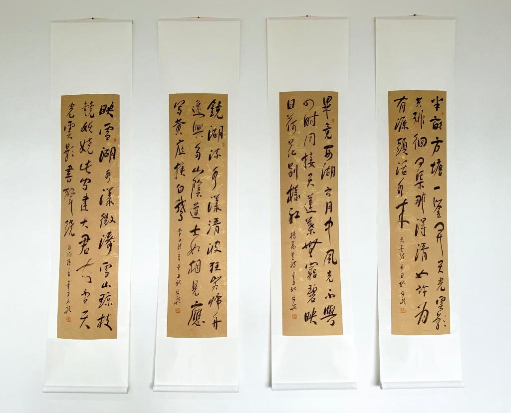 第一组作品内容为描写“春夏秋冬”的四首古诗,寓意图书馆和学校的发展犹如四季更迭、生生不息;第二组作品为描写“梅兰竹菊”的四首著名古诗,给予了对建大师生通过阅读、学习提高个人品性修养,成为道德高尚的“君子”的期望;第三组作品的四首诗均描写湖水,比喻学校图书馆的学习资源就像湖水源源不息,建大人在这里获取知识,好似饮取活水,滋养身心。