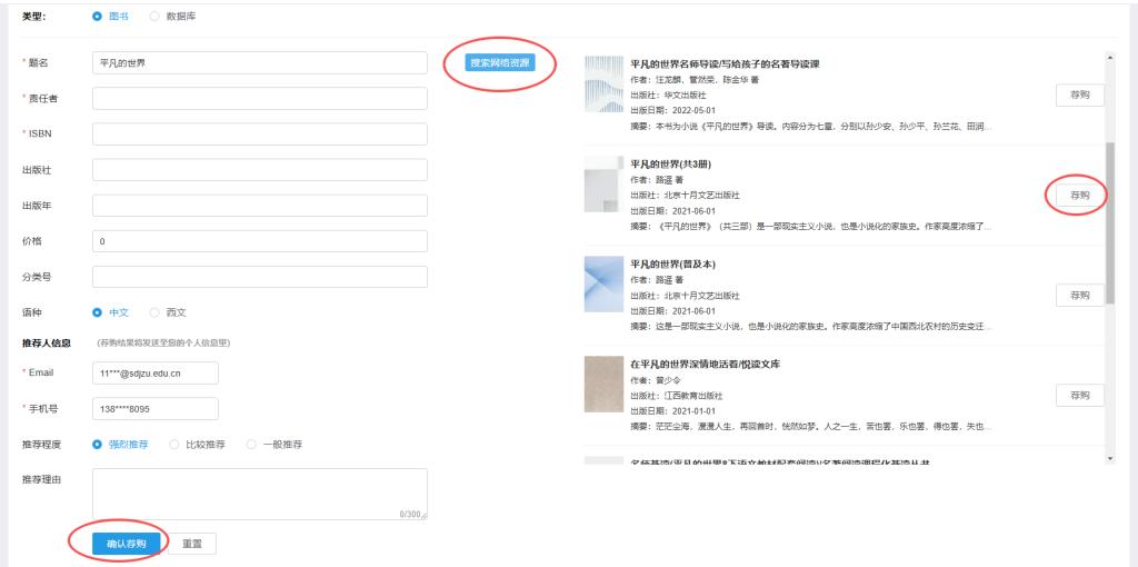 自由荐购:读者已知具体的书名,作者,书号,可直接输入→确认荐购,如果只知书名,输入书名后点击“搜索网络资源”→选择适宜图书→荐购(右侧)→确认荐购(左下角)→完成。