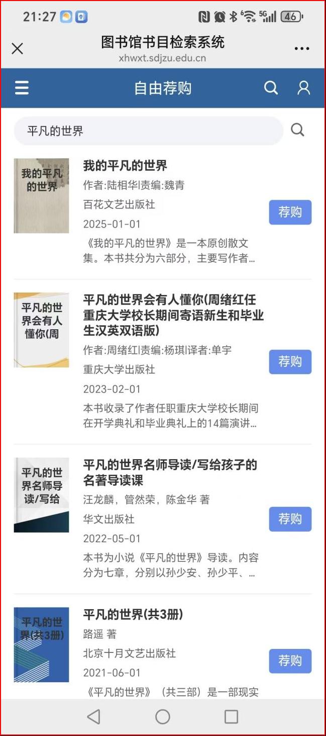 1.智慧建大→图书馆→点击左上角“≡”→荐购→输入相关信息推荐采购