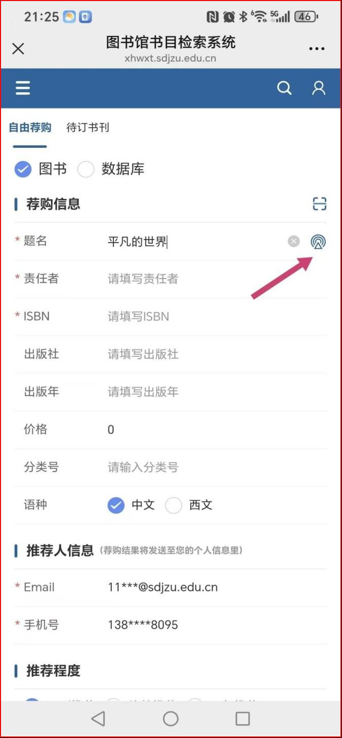 扫码打开网页→可直接输入书名或图书ISBN号→找到所需图书→进入图书详情页面→点击纸质书荐购;