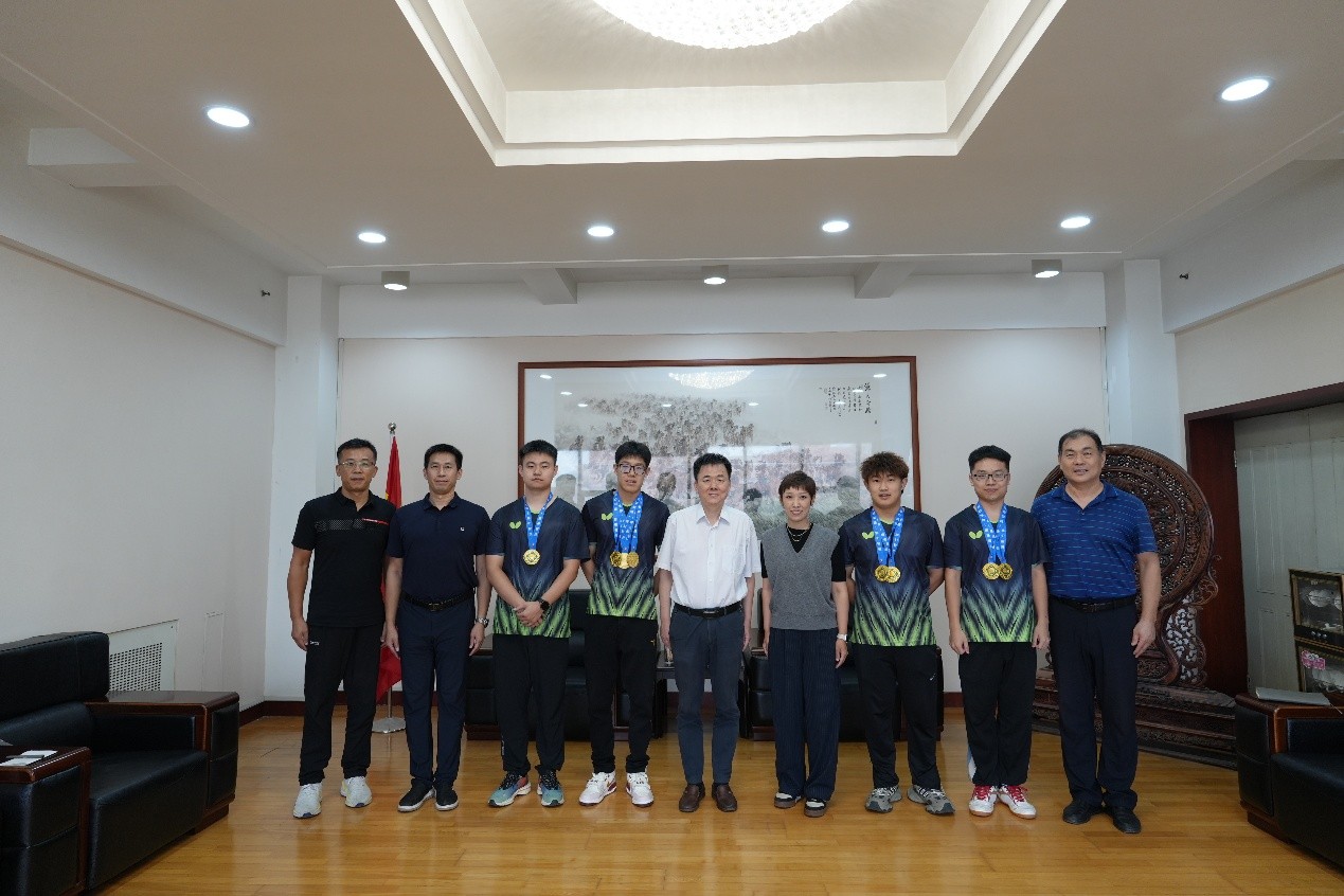 接见活动中,乒乓球队主教练崔小贝对学校领导长期以来的关心与支持表示衷心感谢,并简要介绍了本届赛事的基本情况与取得的成绩。在本次比赛中,我校乒乓球队团结协作、奋勇拼搏,包揽男子团体、男子单打和男子双打三项冠军,总金牌数与山东大学并列第一,展现出优异的竞技水平和良好的精神风貌。