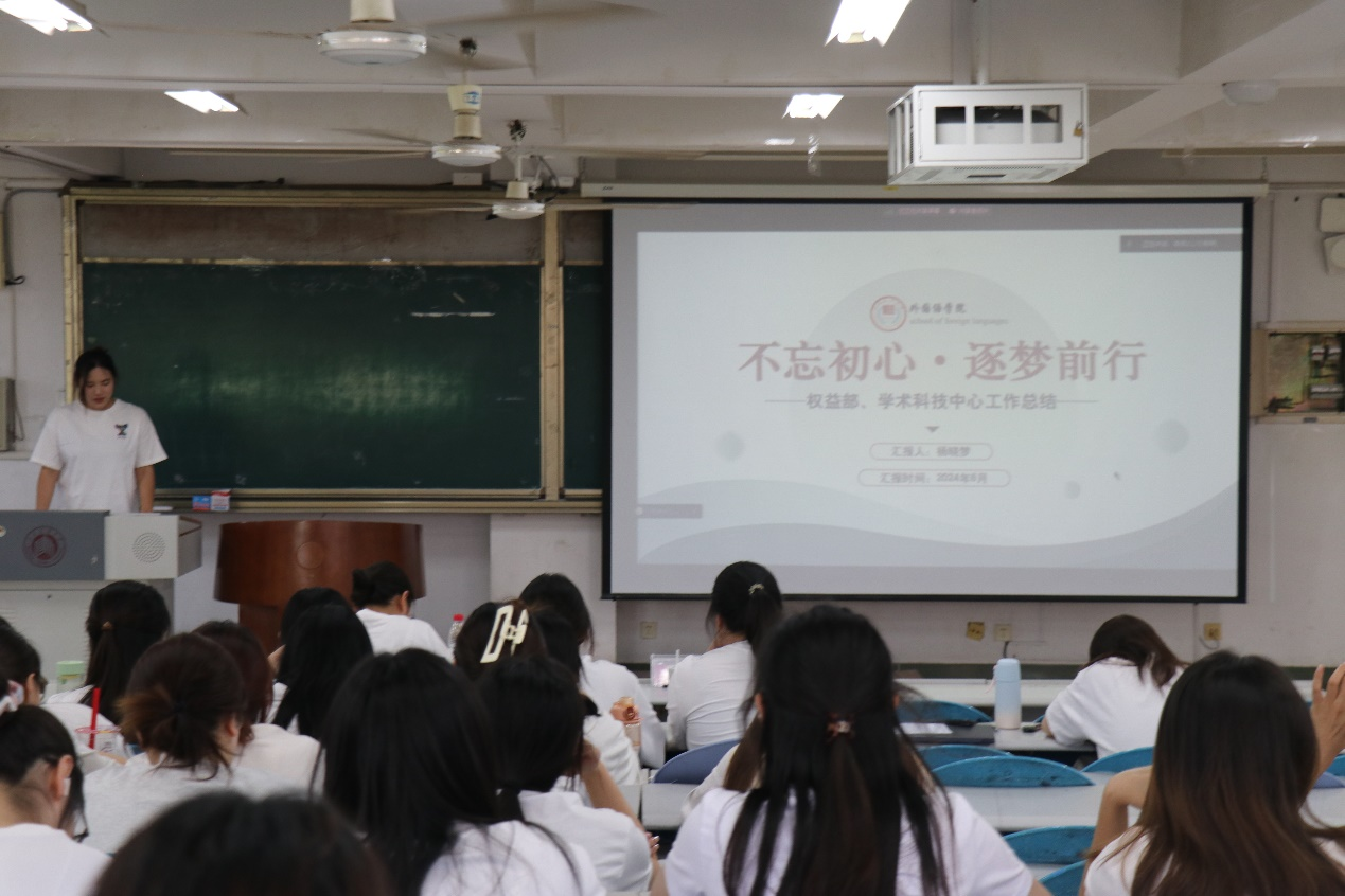 为加强学院组织建设,提升学生干部工作技能,6月27日,外国语学院在外文211举办2023-2024学年学生组织述职大会。学院团委书记杨卫强、辅导员乔婷、王记兵、于婉晴参加述职大会。外国语学院第24届本科生学生组织主席团、部长团参加此次大会。会议由外国语学院学生会主席刘晓萌主持。