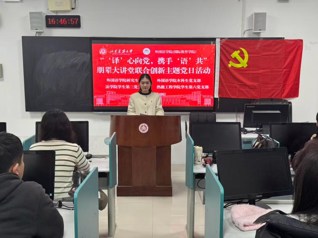 为深入贯彻落实新时代党的建设总要求,充分发挥基层党组织的战斗堡垒作用和党员的先锋模范作用,切实服务青年学生成长成才需求,11月13日,由外国语学院研究生党支部牵头,联合外国语学院本科生党支部、法学院学生第三党支部、热能工程学院学生第六党支部共同举办的“‘译’心向党,携手‘语’共”朋辈大讲堂暨联合创新主题党日活动在外文楼213教室顺利举行。活动由外国语学院研究生党支部书记谷心如主持,外国语学院学生工作办公室主任王冰、学生党员及入党积极分子参加。