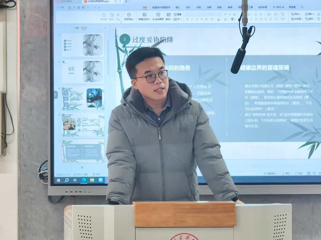 郭佳坤针对当代大学生常见人际困扰,结合宿舍矛盾、小组合作与沟通障碍等真实场景,系统剖析了边界感缺失引发的问题。他以宿舍关系为例,分析作息差异、公共物品使用、回避沟通等具体冲突背后的边界逻辑,指出问题根源在于个体边界意识不清与表达不畅。他强调,健康宿舍关系既需制度约束,更需个人掌握“柔性拒绝”“明确表达”等边界维护能力。此外,他还演示了“非暴力沟通四步法”“情绪缓冲话术”“自我边界清单”“角色扮演演练”等实用工具,帮助学生温和而坚定地建立并维护个人边界。