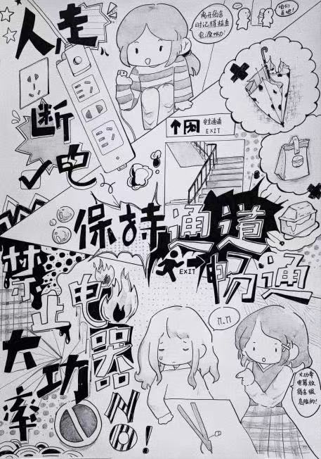 在核心疏散演习之外,学院还搭建起多维度差异化防火安全教育体系,切实筑牢安全防线:组织全院师生集中观看校园火灾警示片,以真实案例强化大家的消防安全警觉性;举办消防安全图标设计大赛,共征集到30余件聚焦宿舍用电规范、逃生路线导视等主题的优秀作品;以宿舍为单位开展消防安全隐患地毯式排查,针对违规电器使用、消防通道堵塞等安全风险建立详细安全台账,由自律会安管部每周进行复查,从源头消除火灾隐患。