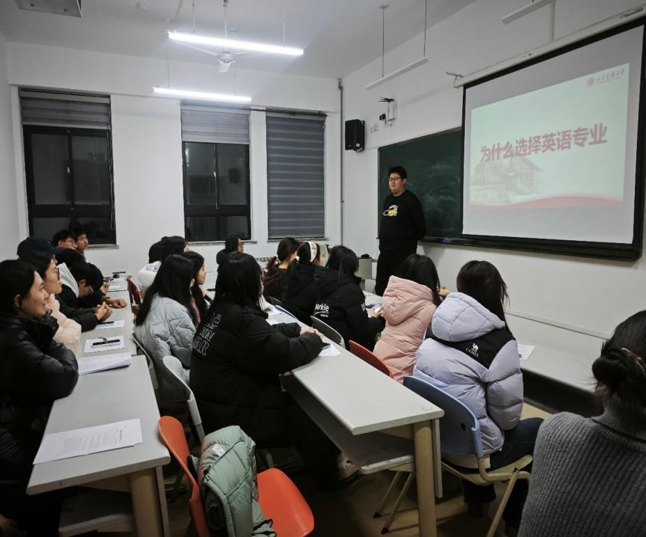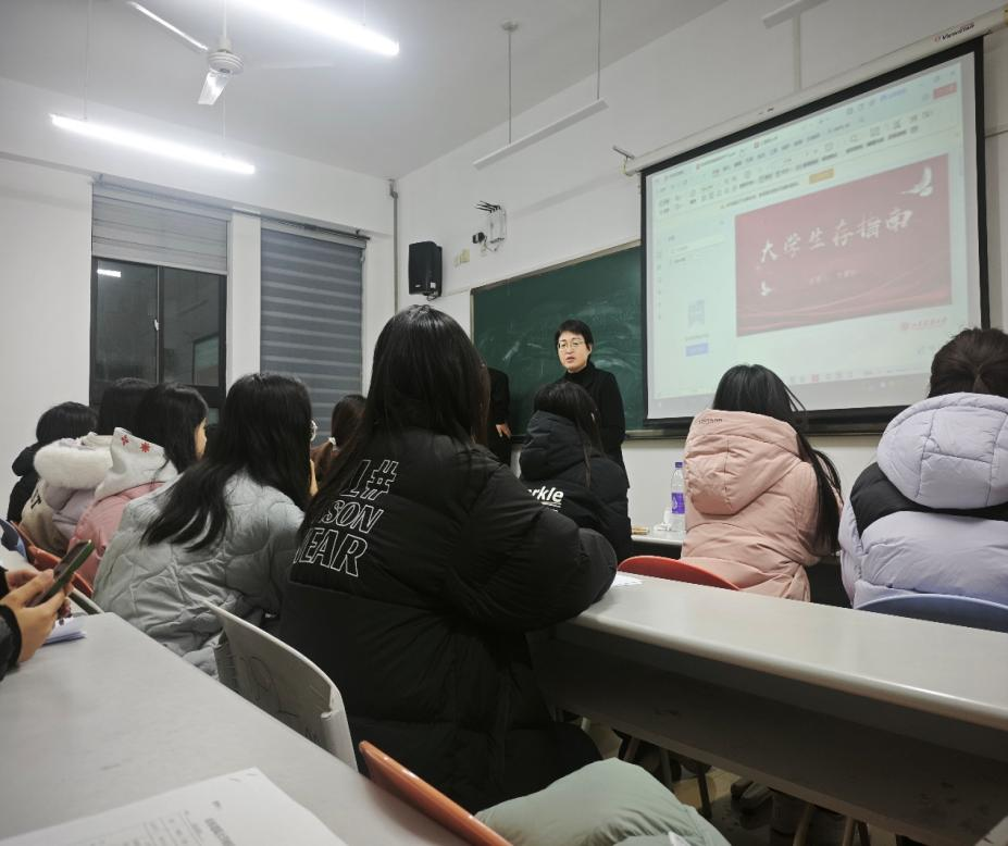 为更好地培养学子参赛意识以及未来专业学习方面的规划,12月21日,英语252班班主任曹儒华邀请到了2025年“大创赛”国家金奖得主的团队负责人,为学院学子分享交流大创赛PPT方面的制作和保研,考研及考公的路径规划。曹儒华在活动伊始亲切寄语,鼓励同学们珍惜与前辈交流的宝贵机会,主动汲取经验、明确方向,在大学时光里做好规划、稳步前行。