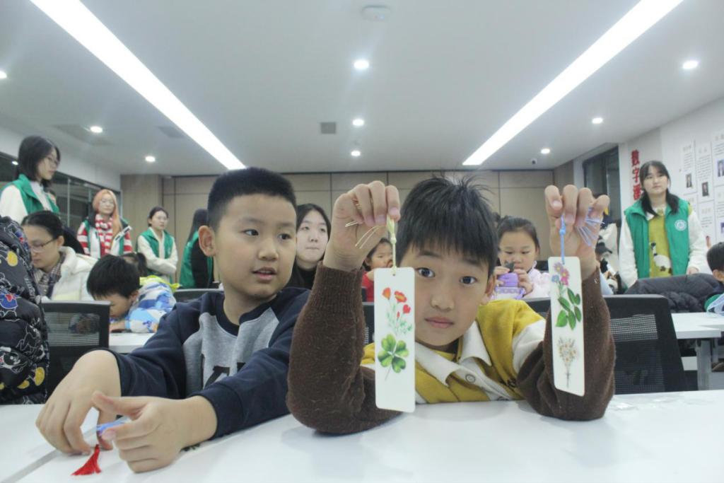 团队深入济南历城区新悦城、溪山居等社区,采用“陪伴+科普”模式开展精准服务。通过前期需求调研,志愿者精心准备动画短片、双语课件等材料,在辅导课业之余,向30余组亲子家庭生动讲解了海南热带雨林国家公园的生态价值。活动还创新开设“雨林之韵、书签传情”双语手工课,孩子们在拼贴植物书签的过程中,聆听中英双语讲解,学写相关英文词汇,于动手实践中激发对自然探索与外语学习的双重兴趣。