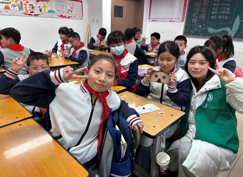 这堂特别的VR课,志愿者们带来了纸质VR眼镜,让孩子们用最环保的方式体验前沿科技。孩子们在惊叹中理解了中国能源建设的成就,同时也在心中点亮了科技报国的星星之火。