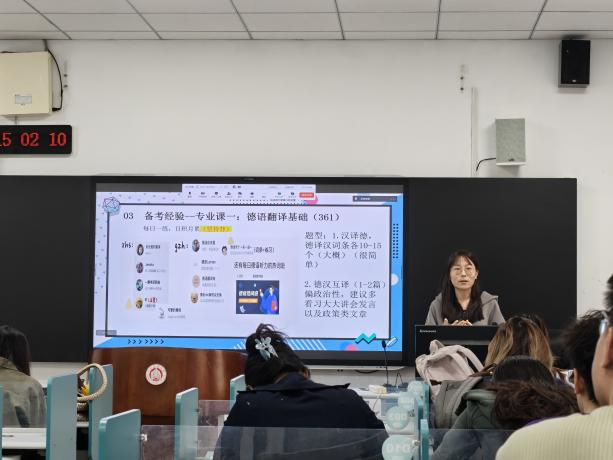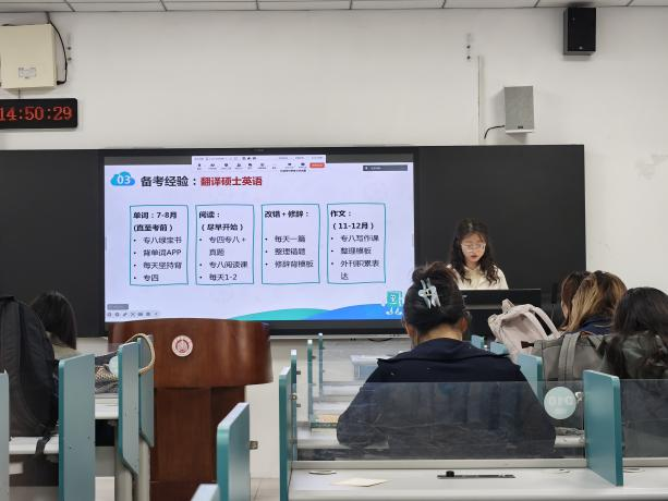 活动伊始,四位优秀研究生结合自身经历,从不同角度分享。英语笔译方向赵睿童围绕“选择大于努力”核心理念,深入讲解择校要点与关键节点,以及时间管理、信息搜索的重要性;李铭杰系统梳理各科目学习方法并分享心态调整策略,助力大家从容应对备考挑战;德语笔译方向王烁聚焦小语种考研特色,精准分享德语笔译的复习方法与备考侧重点,为小语种考研同学指明方向;张莉雯则结合自身跨专业考研经历,分享跨门类备考的实用经验与指南,为不同赛道的备考者提供多元思路参考。