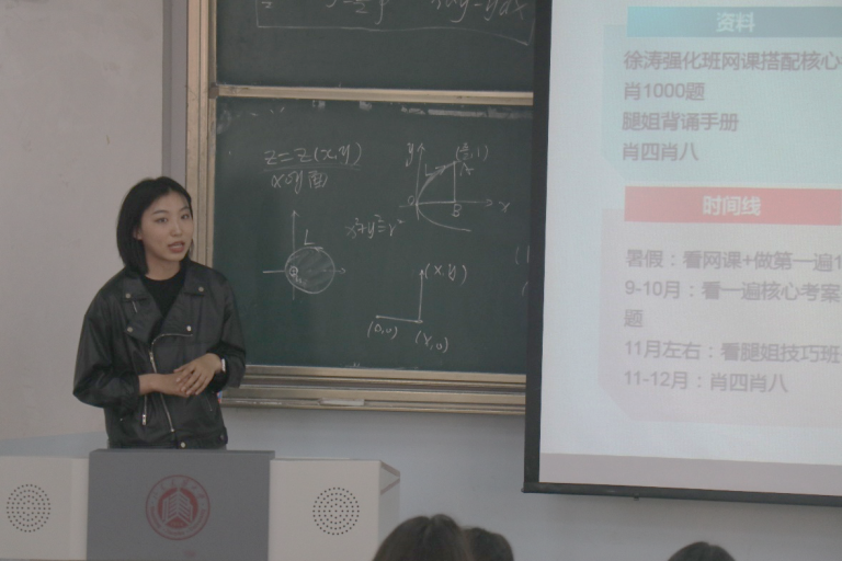 首先是王晓莹进行分享。她结合自身经历告诉我们,备战考研,首先一定要有计划、有思考地去复习,其次是要根据自身实力和兴趣去选择考研学校和方向。