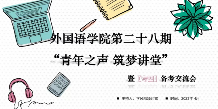 为提升英语专业学生备考技能,完善复习策略,推动专四通过率再上新台阶,4月16日晚,外国语学院开展了第二十八期“青年之声,筑梦讲堂”暨专四备考交流会,外国语学院2021级全体同学积极参与本次会议。