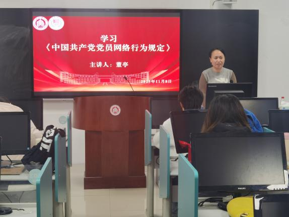 董亭以“网络安全”为主题,领学《中国共产党党员网络行为规定》,对党员在网络上的信息发布、交流互动、网络监督等方面的行为规定进行了详细解读,确保参会同学都了解、掌握党员实施网络行为的规定和要求。她强调在网络行为中要始终坚持正确政治方向,积极传播正能量,弘扬主旋律,自觉抵制各种错误思潮和不良信息。要严格遵守党的纪律和国家法律法规,不发表、不传播违背党的基本理论、基本路线、基本方略的言论,不参与非法网络活动,不制造和传播网络谣言。同时,她呼吁各位同学,当发现违规、违纪、违法的网络信息活动时,应当及时向有关部门和网络平台举报,以实际行动践行网络安全。