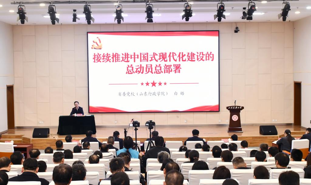 根据省委统一安排,11月18日下午,学习贯彻党的二十届四中全会精神省委宣讲团在山东建筑大学宣讲。省委宣讲团成员、省委党校(山东行政学院)分管日常工作的副校长(副院长)白皓以《接续推进中国式现代化建设的总动员总部署》为题作宣讲报告。山东建筑大学党委书记杨景波主持报告会。