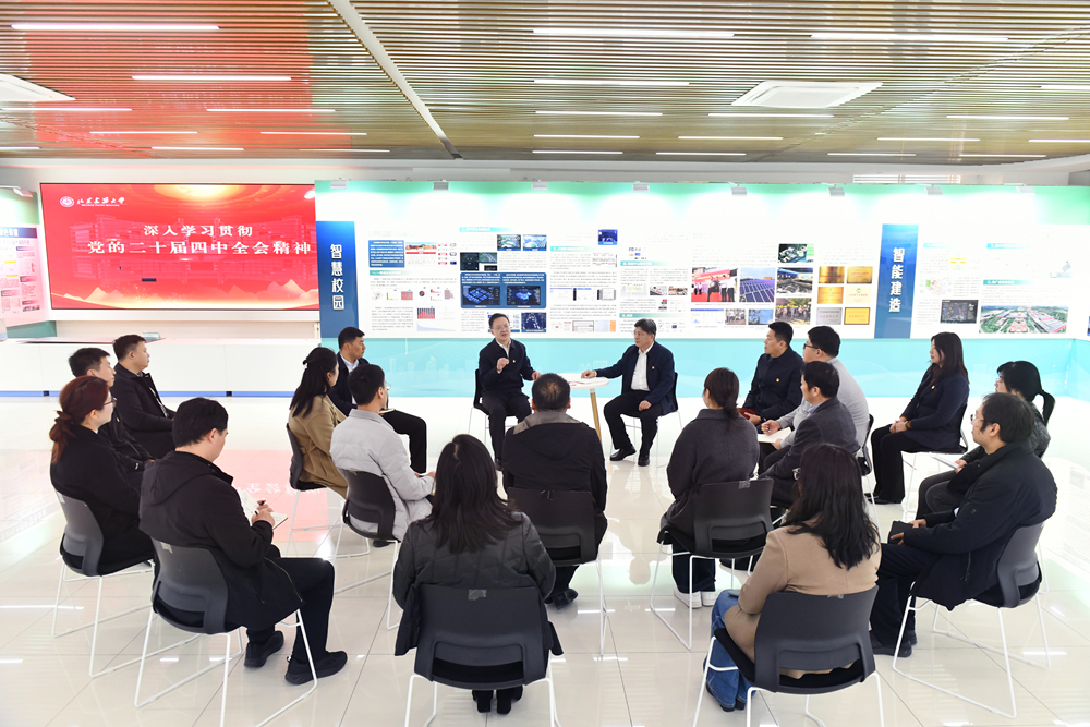 白皓实地调研参观了学校“绿色 低碳 智慧——山东建筑大学智慧城市展厅”和“建筑结构加固改造与地下空间工程”教育部重点实验室,并与师生分享学习党的二十届四中全会精神感悟,逐一回答师生代表提问。白皓对山东建筑大学近年来取得的成绩给予肯定,希望学校以学习贯彻全会精神为契机,聚焦博士学位授权建设,聚力教育、科技、人才三大领域任务,协同发力、整体推进,不断培育和发展新质生产力,在“十五五”时期实现新的更大发展。