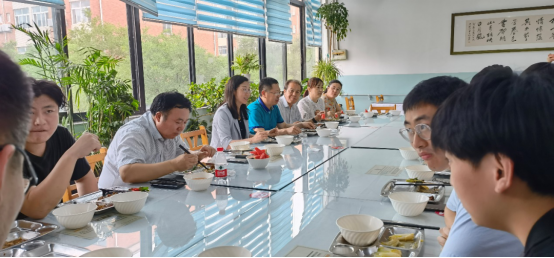 宿舍中,老师们与毕业生进行了亲切的交流,详细询问了毕业生的毕业去向、毕业设计和离校准备情况,了解了毕业生在学习、生活及就业中存在的困难以及未来规划。走访宿舍结束后,老师与同学们共进午餐、交流座谈。餐桌上,老师们认真倾听毕业生的想法和对学校学院发展的建议,边吃边聊,语言幽默,气氛活跃。在交流中,院长何芹希望即将就业的同学们要在新的岗位上积极进取、踏实工作;副书记卞梅希望暂未就业的同学能够根据自身实际情况树立理性的择业、就业观;副院长王忠雷勉励升学的同学们要在科研学习的道路上奋力拼搏、贡献力量。