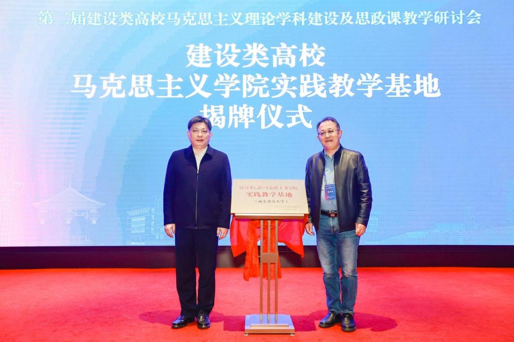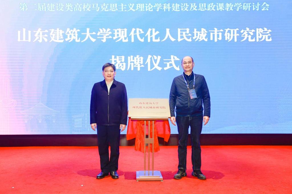 在揭牌仪式环节,黄志良与杨景波共同为“建设类高校马克思主义学院实践教学基地”揭牌;庄友刚与杨景波为“山东建筑大学现代化人民城市研究院”揭牌。此次签约合作及两大平台的成立,将推动马克思主义理论与建筑实践深度融合,为中国式现代化城市高质量发展注入智力支撑。
