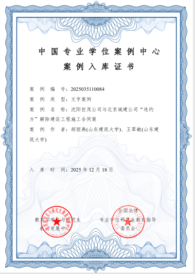 近日,根据全国法律专业学位研究生教指委通知,由山东建筑大学法学院郝丽燕、王翠敏两位老师共同撰写的法律硕士教学案例——《沈阳世茂公司与北京城建公司“违约方”解除建设工程施工合同案》被中国专业学位案例中心案例库正式收录入库,并荣获教育部学位与研究生教育发展中心及全国法律专业学位研究生教育指导委员会颁发的入库证书(编号为2025035110084)。据悉,中国专业学位案例中心是由教育部学位与研究生教育发展中心联合各相关专业学位研究生教指委共同建设的国家级案例教学服务平台,其收录的案例均经过严格的筛选与评审,需具备较强的实践性、典型性与学术价值,能够为专业学位研究生的教学与研究提供高质量的实践素材。